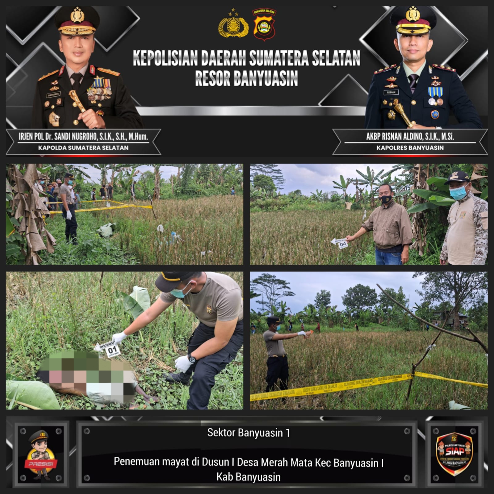 Warga Dusun I, Desa Merah Mata, Kecamatan Banyuasin I, Kabupaten Banyuasin, dikejutkan dengan penemuan jenazah seorang perempuan tanpa identitas di pinggiran sawah pada Kamis (26/3/2026) sekitar pukul 12.00 WIB.
