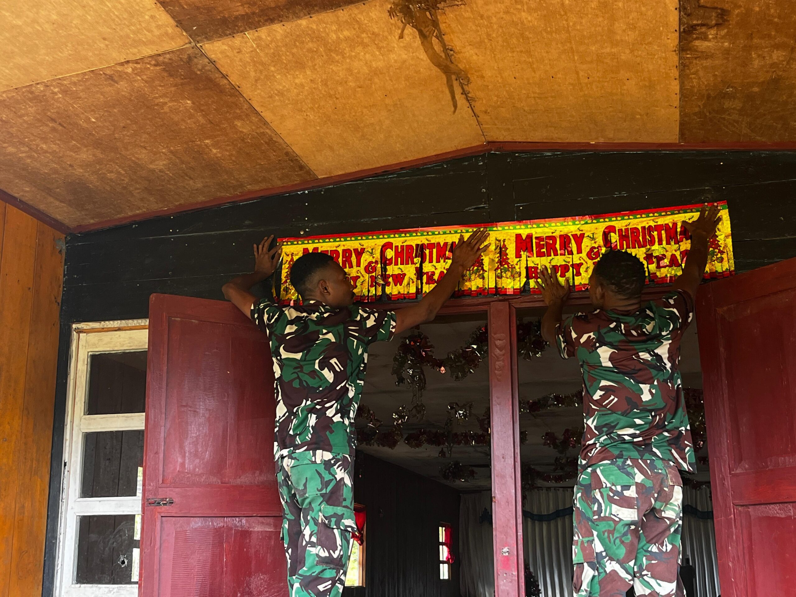 Pos Mimin Satgas Pamtas RI–PNG Yonif 751/Vira Jaya Sakti (VJS) membangun pondok Natal dengan meriah sebagai wujud upaya menghidupkan suasana Hari Raya Natal di wilayah perbatasan. Di tengah kegelapan hutan pegunungan, lampu-lampu Natal tampak menyala indah, menghadirkan nuansa hangat sekaligus menjadi simbol harapan dan sukacita bagi prajurit serta masyarakat sekitar.(Jumat,19/12/2025).
