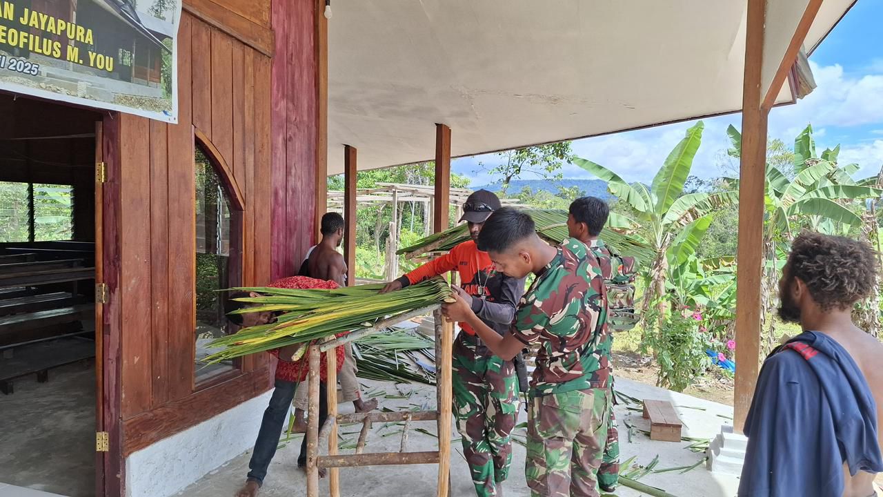 Pos Selal Satgas Pamtas RI–PNG Yonif 751/Vira Jaya Sakti (VJS) bersama masyarakat Kampung Kalomdol melaksanakan kegiatan pembuatan pondok Natal sebagai bagian dari persiapan menyambut Perayaan Hari Raya Natal. Kegiatan gotong royong ini menjadi wujud kebersamaan aparat TNI dengan warga dalam menciptakan suasana perayaan yang rapi, nyaman, dan penuh sukacita di wilayah perbatasan.(Selasa,16/12/2025).