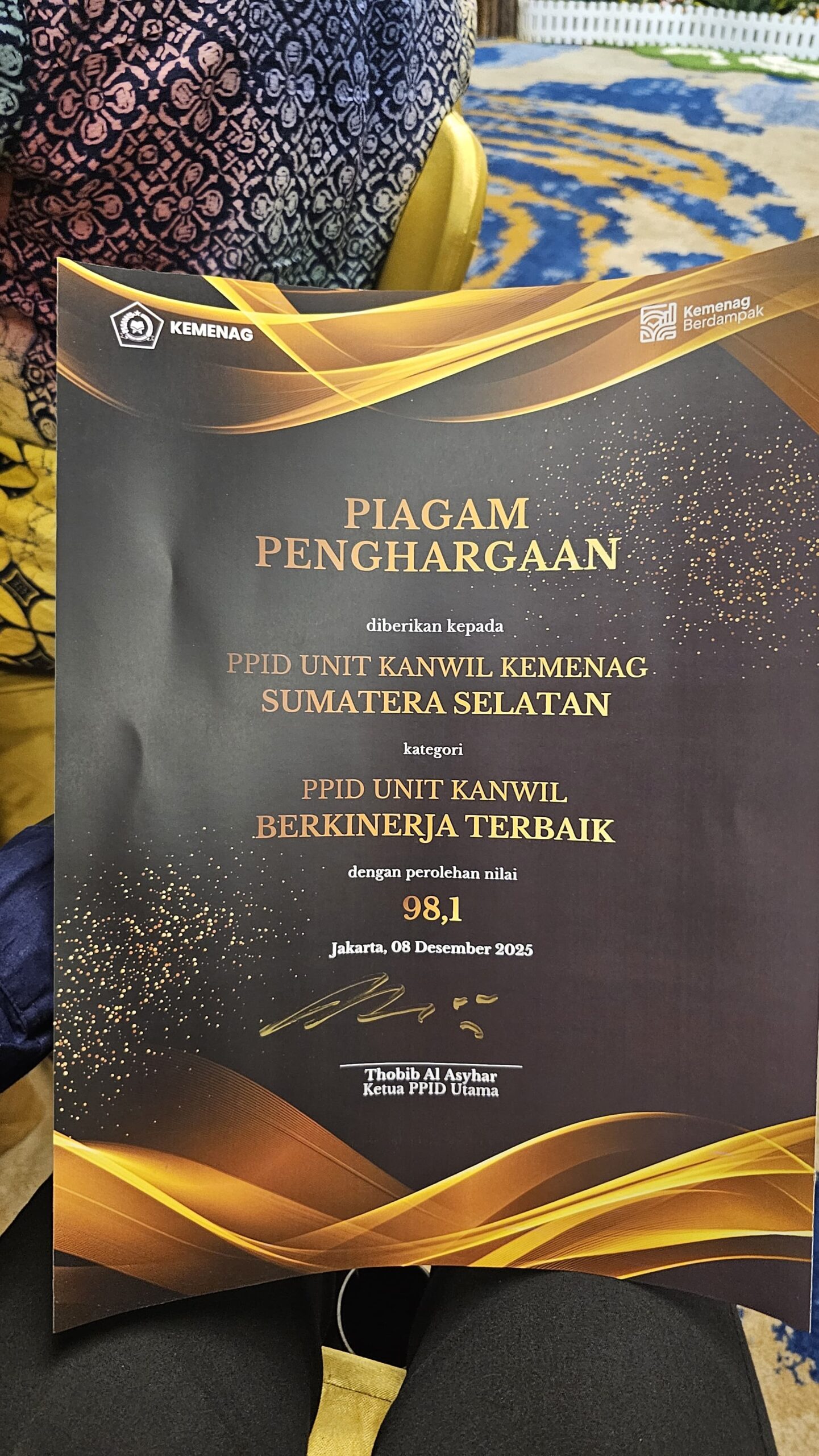 Penghargaan diserahkan Kepala Biro Humas dan Komunikasi Publik Sekretariat Jenderal Kemenag RI Thobib Al Asyhar selaku Ketua PPID Utama Kemenag pada Kegiatan Evaluasi Keterbukaan Informasi Publik Tahun 2025 di Hotel Luminor Padjajaran Bogor, Senin (08/12/2025) malam. Penghargaan diterima Tim PPID Kanwil Kemenag Sumsel Irfan Amrullah.