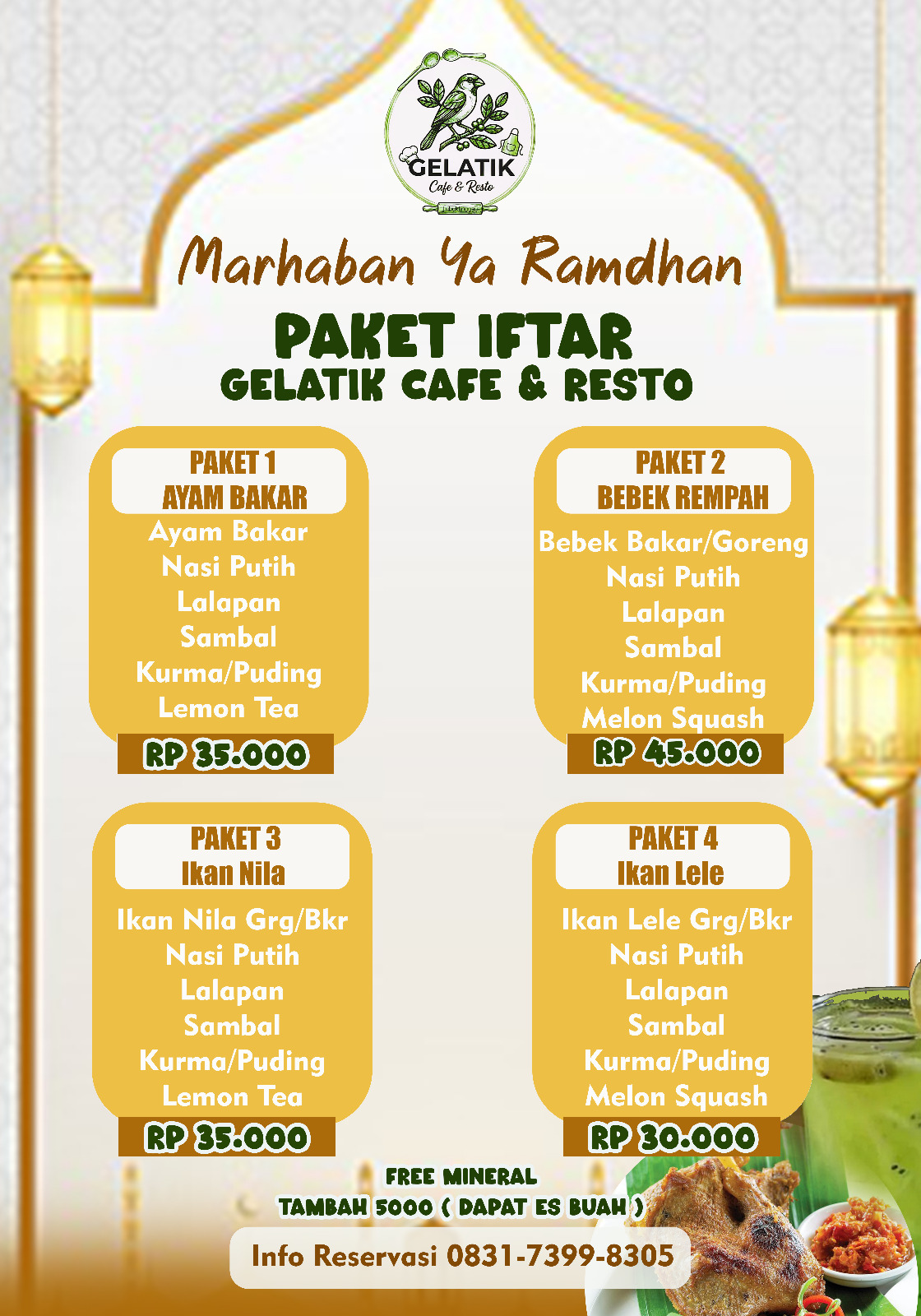 Berbagai pilihan menu tersedia di Resto Gelatik, mulai dari aneka takjil untuk membatalkan puasa, hidangan utama dengan cita rasa khas nusantara, hingga berbagai pilihan dessert yang menyegarkan. Dengan pilihan menu yang lengkap serta tempat yang luas dan nyaman, tidak heran jika Resto Gelatik menjadi salah satu rekomendasi favorit masyarakat untuk mengadakan buka puasa bersama.