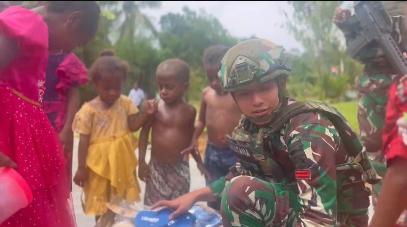 Satgas Pamtas RI-PNG Kewilayahan Yonif 763/SBA Pos Afkrem bersama masyarakat melaksanakan kegiatan Pembinaan Teritorial dengan cara Berbagi Sendal untuk anak-anak Kampung Afkrem, Distrik Aifat Selatan, Kabupaten Maybrat, Provinsi Papua Barat Daya (3/11/2025).