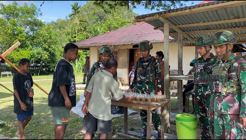 Satgas Pengamanan Perbatasan (Pamtas) RI–PNG Yonif 763/SBA Pos Kokas kembali menunjukkan kepeduliannya terhadap masyarakat perbatasan dengan membagikan makan gratis berupa bubur kacang hijau kepada warga dan anak-anak di Kampung Kokas, Distrik aifat utara, Kabupaten Maybrat,(20/12/2025).