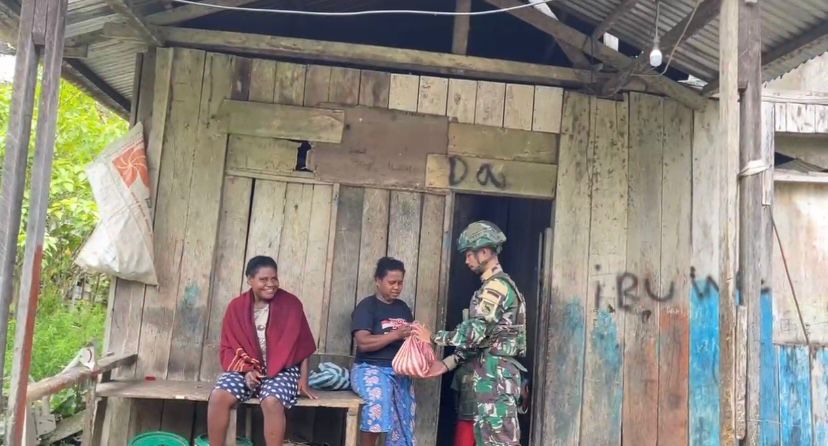 Dalam rangka mempererat hubungan dengan masyarakat, personel Satgas Pamtas RI-PNG Kewilayahan Yonif 763/SBA Pos Joshiro melaksanakan kegiatan pembagian sembako kepada masyarakat (21/10).