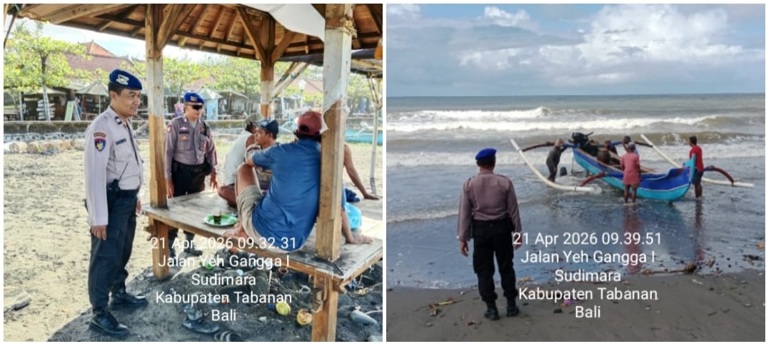Personel Satuan Polairud Polres Tabanan melaksanakan patroli pesisir dan sambang wilayah Pantai Yeh Gangga pada Selasa, 21 April 2026 pukul 10.00 Wita. Kegiatan ini dilakukan oleh Aiptu Satriyo Tranggono dan Bripka I Putu Sukerta dengan menyusuri area pantai guna memantau aktivitas masyarakat, nelayan, serta pengunjung yang beraktivitas di kawasan pesisir.