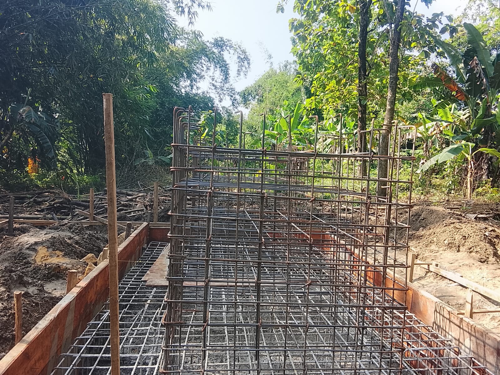 Di tengah rimbunnya pepohonan dan kondisi medan yang cukup menantang, para pekerja dengan telaten merangkai besi demi besi, memastikan kekuatan struktur sebelum memasuki tahap pengecoran. Kegiatan ini menjadi bagian krusial dalam pembangunan, karena kualitas rangka besi sangat menentukan ketahanan jembatan dalam jangka panjang.
