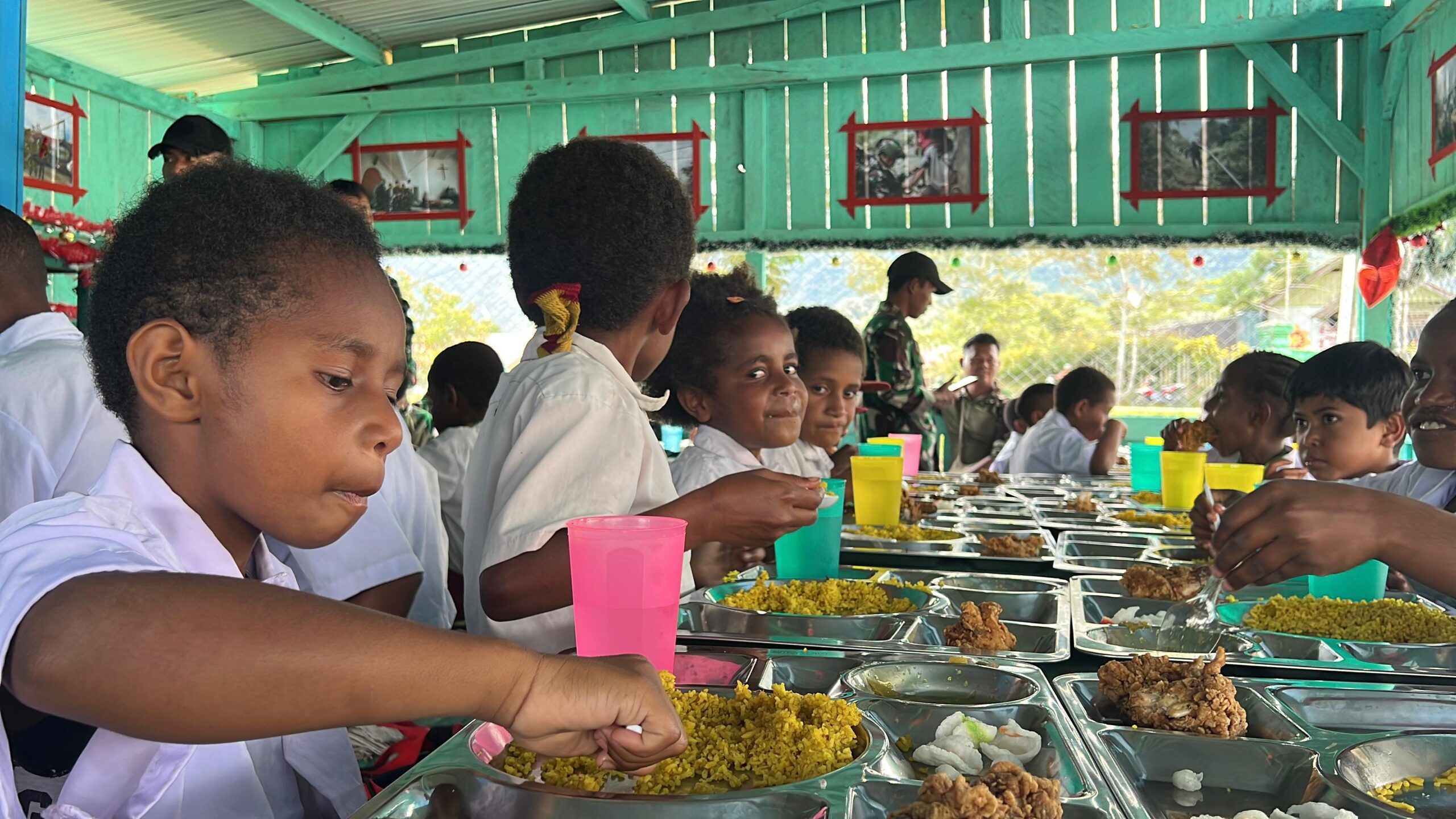Dalam kegiatan tersebut, para siswa menerima menu makan siang berupa nasi kuning, sayur, dan ayam. Prajurit Pos Kotis juga menyapa anak-anak, memberi motivasi agar rajin belajar dan disiplin, serta mengajak mereka menikmati momen kebersamaan yang sederhana namun bermakna.