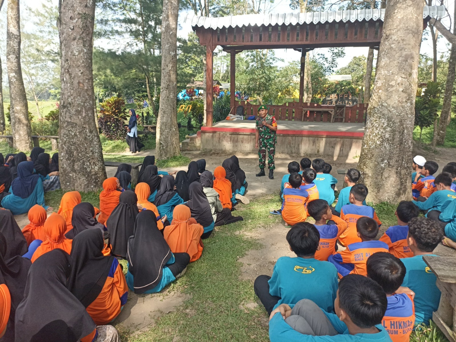 Dalam menanamkan semangat cinta tanah air sejak dini, Bati Komsos Koramil 0808/02 Garum Pelda Slamet R memberikan materi pengenalan Bela Negara kepada peserta perkemahan SD IT Alhikmah Kelurahan Bence. Kegiatan ini dilaksanakan di kawasan wisata Bon C perkebunan Petung Ombo Desa Karangrejo Kecamatan Garum Kabupaten Blitar, Kamis (9/10/2025).