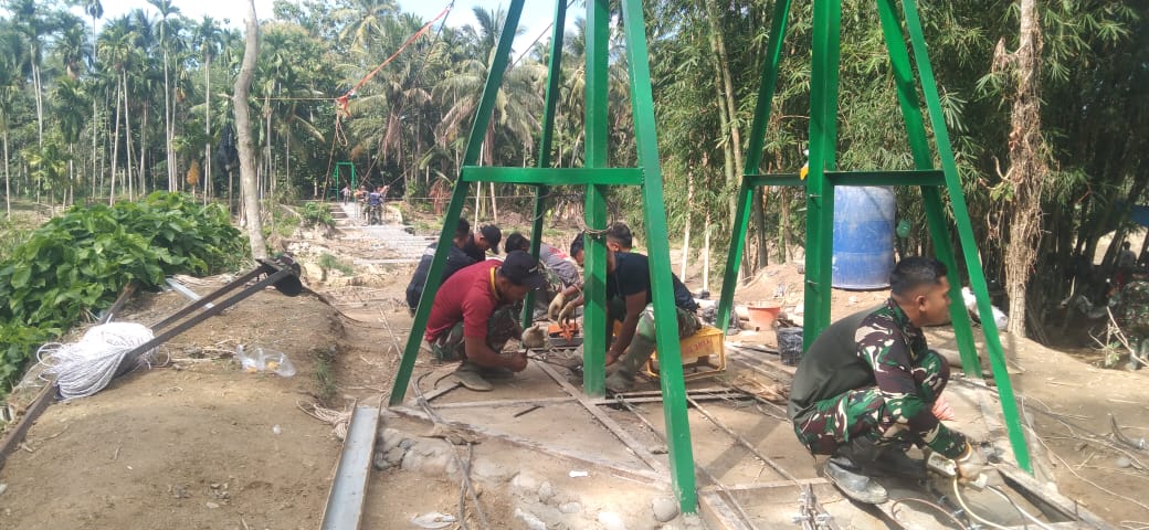 Pengerjaan di lapangan saat ini memasuki tahap teknis yang cukup krusial dan membutuhkan ketelitian tinggi. Para prajurit terlihat fokus melakukan pemasangan tali rawaian serta pengelasan besi hollow untuk struktur lantai dasar jembatan. Tahap ini sangat menentukan kestabilan jembatan gantung agar mampu memberikan keamanan maksimal bagi masyarakat yang akan melintasinya.