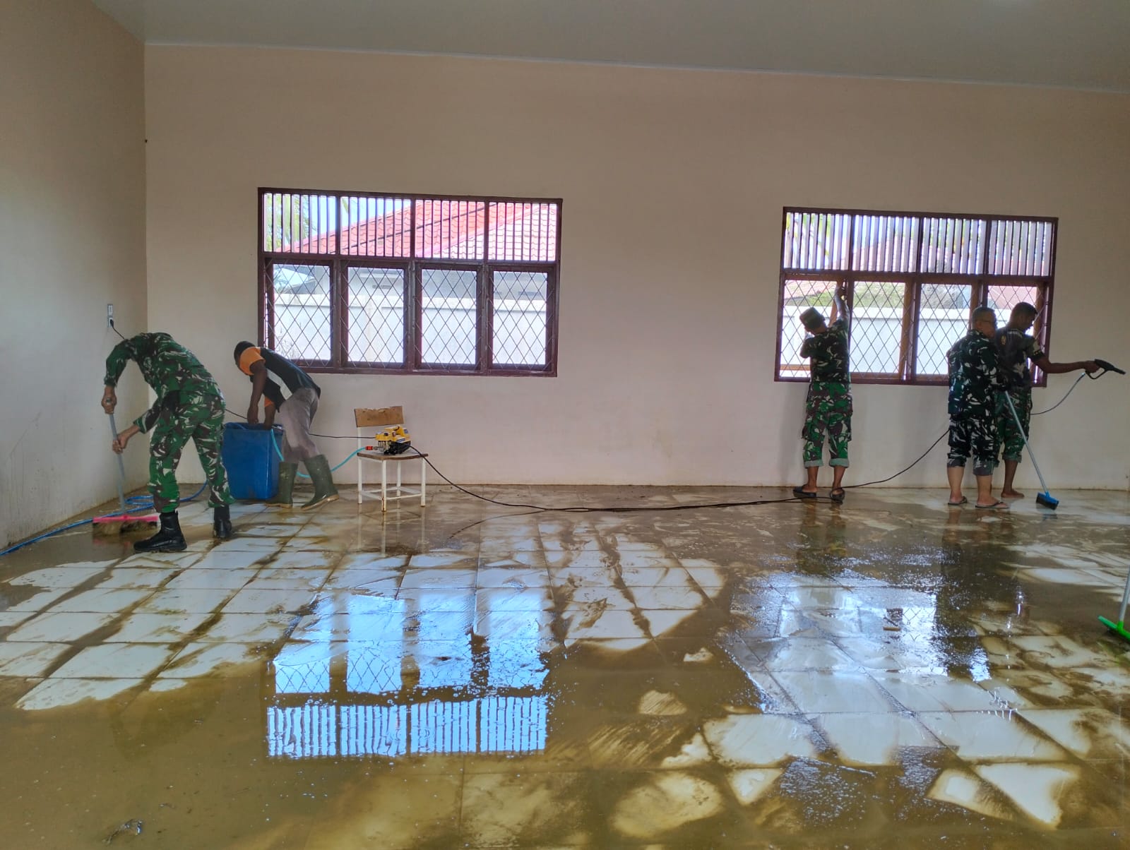 Sementara itu, Kepala Sekolah SMK Negeri 1 Lapang menyampaikan apresiasi setinggi-tingginya atas bantuan tenaga dari personel Pos Koramil Lapang. “Dukungan para Babinsa sangat meringankan beban kami dalam menata kembali ruang perpustakaan dan lab yang sempat kotor akibat banjir,” ujarnya.