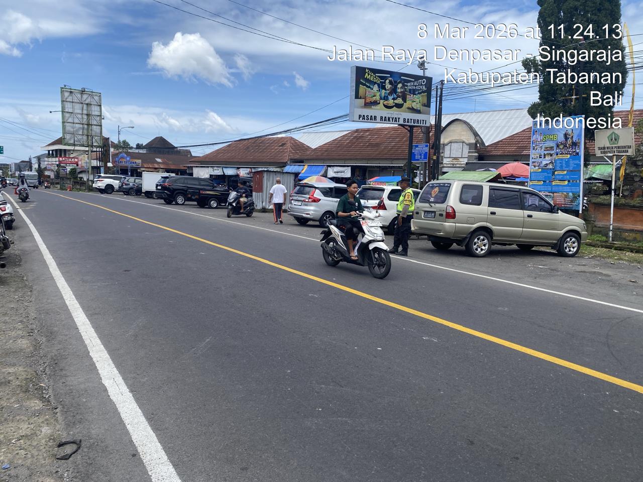 Polsek Baturiti melaksanakan kegiatan strong point siang pada Minggu, 8 Maret 2026 mulai pukul 11.00 WITA bertempat di depan Pasar Baturiti, Kecamatan Baturiti, Kabupaten Tabanan. Kegiatan tersebut dilaksanakan oleh personel Polsek Baturiti yaitu Aiptu I Wayan Putra Adnyana bersama Brigadir Putu Septian sebagai bentuk pelayanan kepada masyarakat dalam menjaga keamanan serta kelancaran arus lalu lintas di kawasan pasar.