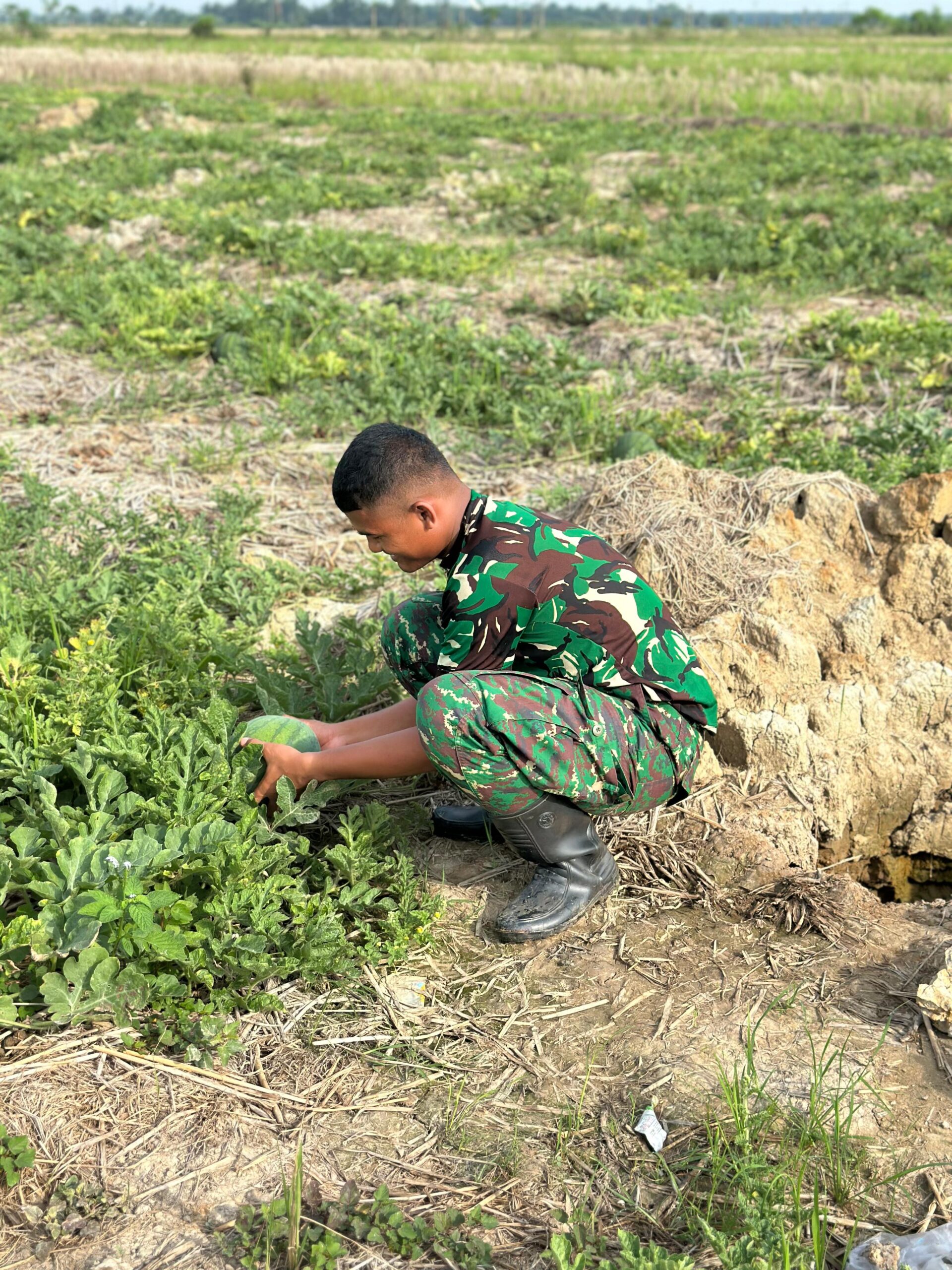 Selain pengerjaan infrastruktur seperti jalan dan jembatan, personel Satgas TMMD bersama Babinsa aktif turun ke lapangan membantu para petani. Salah satunya terlihat di lahan semangka milik Ahmad Iksan, di mana prajurit TNI turut melakukan penyiraman dan perawatan tanaman.