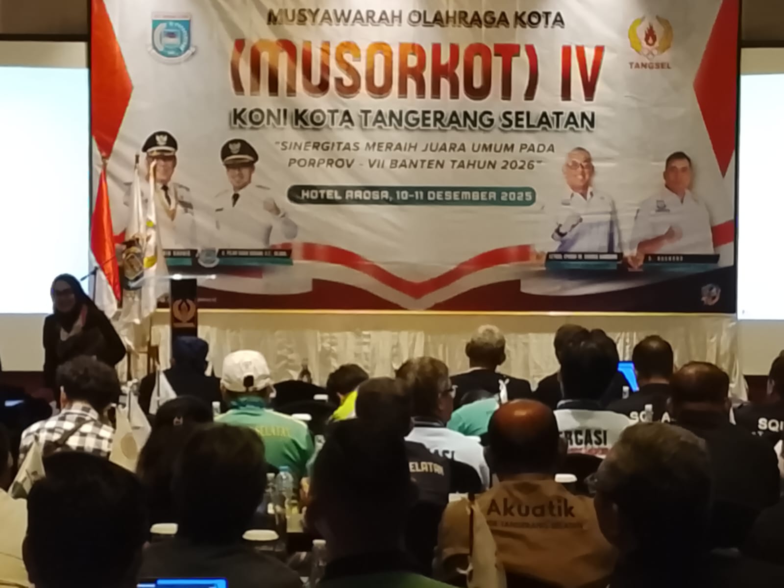 Musyawarah Olahraga Kota (Musorkot) IV KONI Kota Tangerang Selatan digelar di Hotel Arosa, Bintaro, Rabu (10/12/2025). Forum empat tahunan ini menjadi ajang penataan ulang arah pembinaan olahraga sekaligus penguatan strategi menuju Porprov VII Banten 2026.