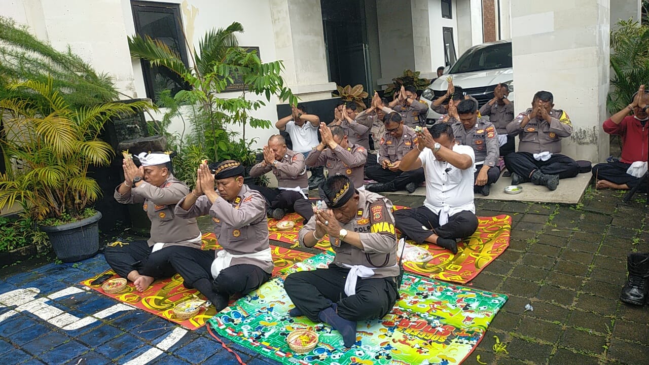 Kapolsek Kediri Kompol Putu bersama personil yang beragama Hindu yang dipimpin langsung Jro Mangku I Wayan Sukarma melaksanakan persembahyangan bersama di Pure Padmasana Polsek Kediri pada saat purnama sasih kesange hari Selasa, 3-3-2026 pukul 08.30 Wita.