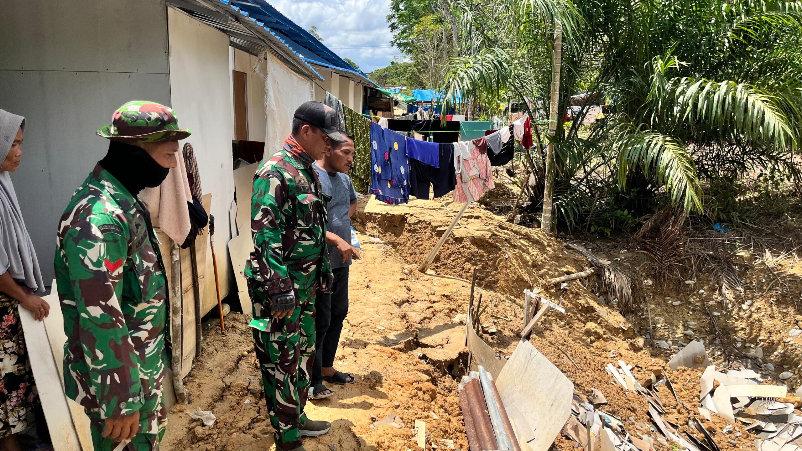 PLH Danramil 29/Langkahan Kodim 0103/Aceh Utara, Kapten Cke Edi Wijaya, bersama Babinsa Koptu S. Harahap meninjau langsung kondisi hunian sementara warga di Dusun Tengoh, Desa Bukit Lintang, Kecamatan Langkahan, menyusul laporan genangan air saat hujan deras. Kamis (9/4/2026).