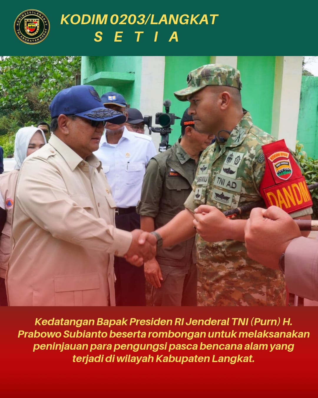 Kunjungan ini diapresiasi tinggi oleh Pemerintah Kabupaten Langkat dan jajaran Kodim 0203/Langkat. Dandim 0203/Langkat, Letkol Inf Medwin Sangkakala, S.Sos., M.Han, mendampingi Presiden selama peninjauan dan memastikan koordinasi di lapangan berjalan optimal.