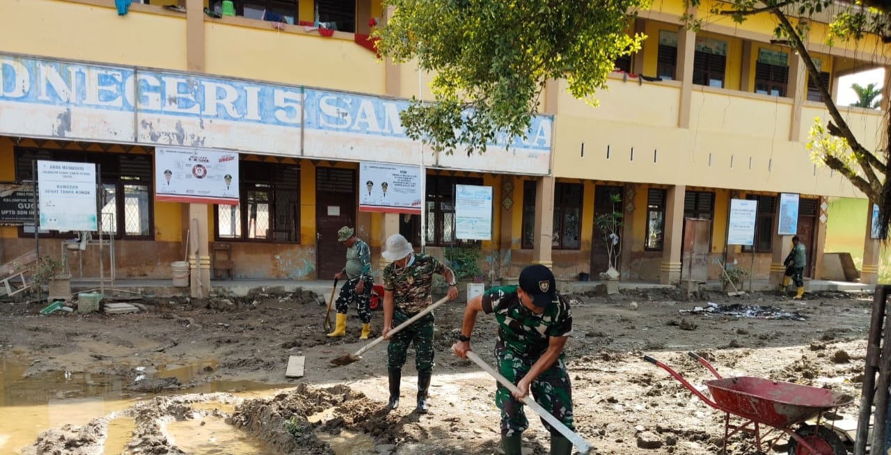 Danramil 06/Samudera menyampaikan bahwa pembenahan dilakukan secara teliti agar seluruh sudut sekolah benar-benar bersih dan aman. “Kami mengerahkan personel untuk melanjutkan pembenahan ini secara manual. Fokus kami adalah memastikan tidak ada lagi material sisa yang menghalangi jalan maupun area bermain siswa, sehingga kenyamanan proses belajar mengajar bisa segera kembali seperti semula,” ujarnya di lokasi kegiatan.