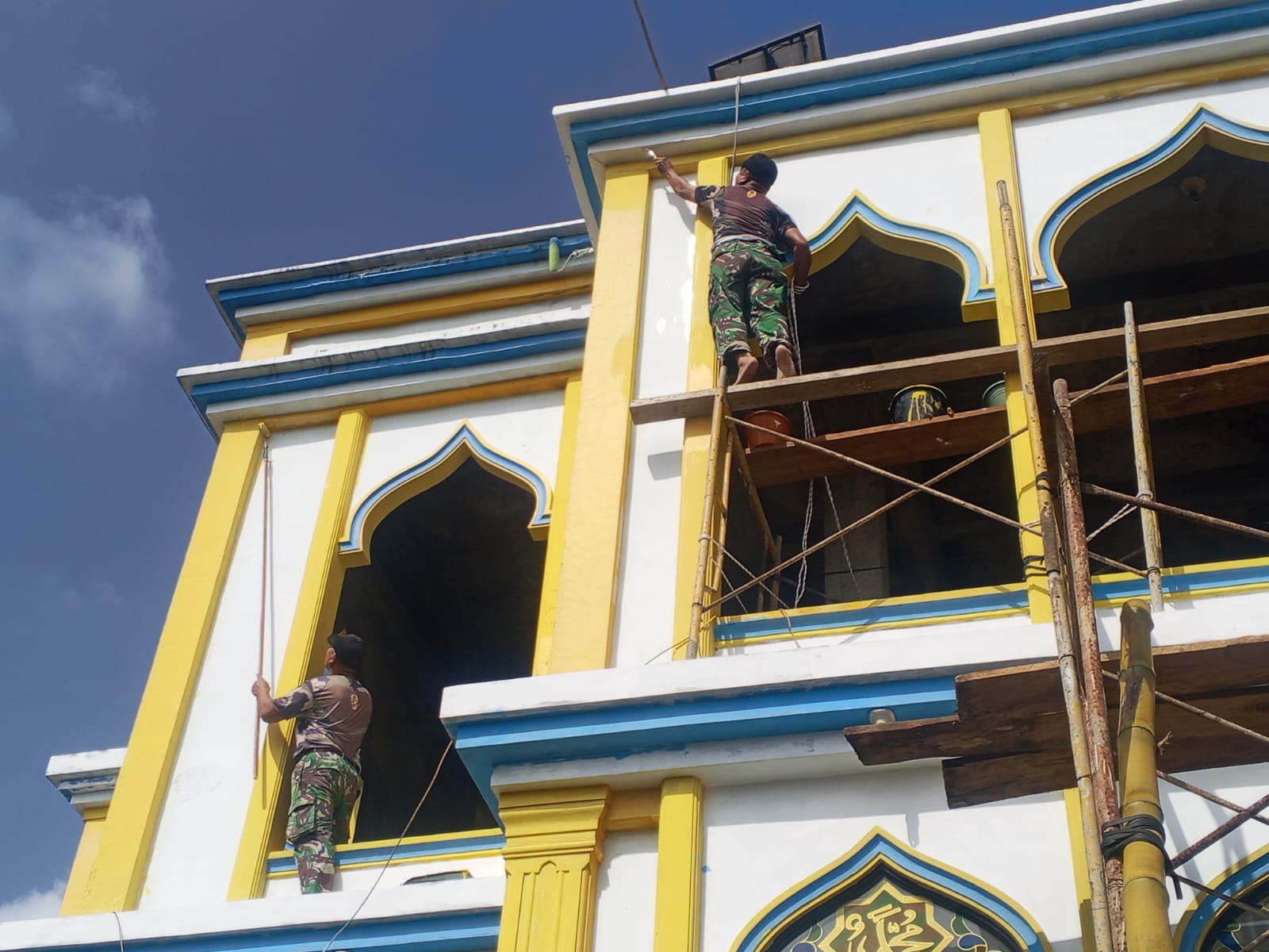 Kegiatan yang memasuki hari ketiga ini difokuskan untuk memperbaiki tampilan bangunan masjid yang mulai kusam dan kotor akibat dampak banjir. Berdasarkan pengerjaan di lapangan, progres pengecatan kini telah mencapai angka 65%. Para prajurit TNI dan warga terlihat kompak menaiki perancah untuk mengecat bagian dinding atas dan pilar-pilar masjid dengan warna putih dan kuning yang cerah.