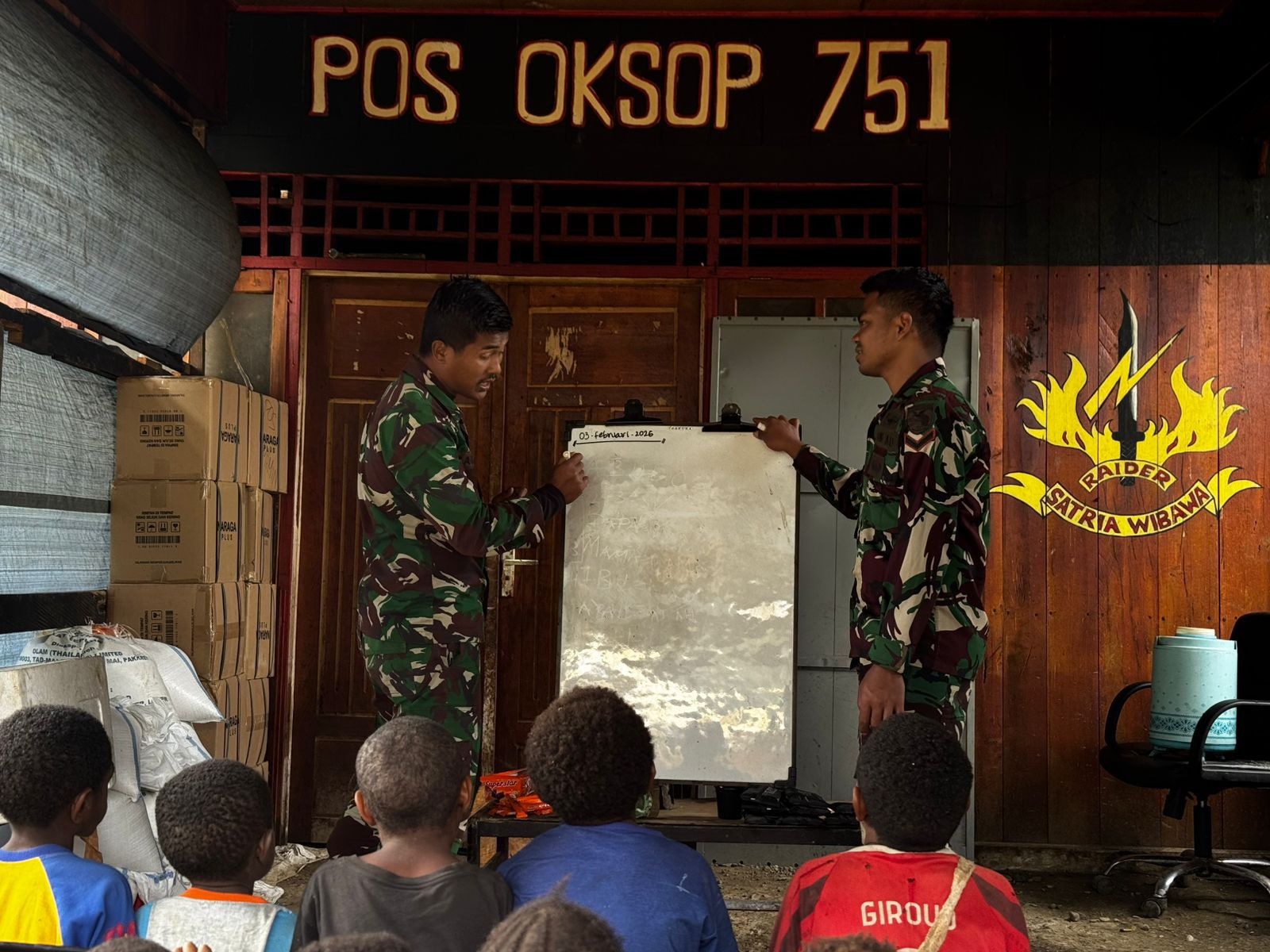 Pos Oksop Yonif 751/Vira Jaya Sakti (VJS) Satgas Swasembada melaksanakan kegiatan belajar calistung (membaca, menulis, dan berhitung) bagi anak-anak perbatasan di pos. Kegiatan ini menjadi bagian dari pembinaan teritorial yang edukatif sebagai upaya mencerdaskan anak bangsa, sehingga kelak mereka memiliki masa depan yang lebih cerah dan siap menjadi generasi penerus bangsa. (Minggu,22/2/2026).