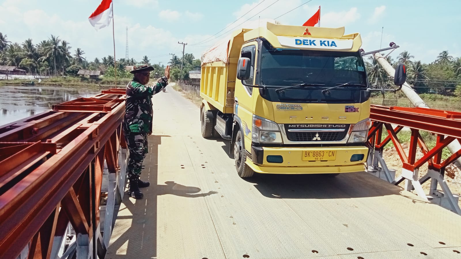 Di lapangan, Babinsa tampak sigap mengatur lalu lintas truk bermuatan berat agar tetap tertib saat menyeberang. “Tugas kami memastikan infrastruktur ini tetap kokoh, karena jembatan ini adalah urat nadi ekonomi warga antar desa,” ujar salah satu Babinsa Koramil 03/Dewantara di sela kegiatannya.