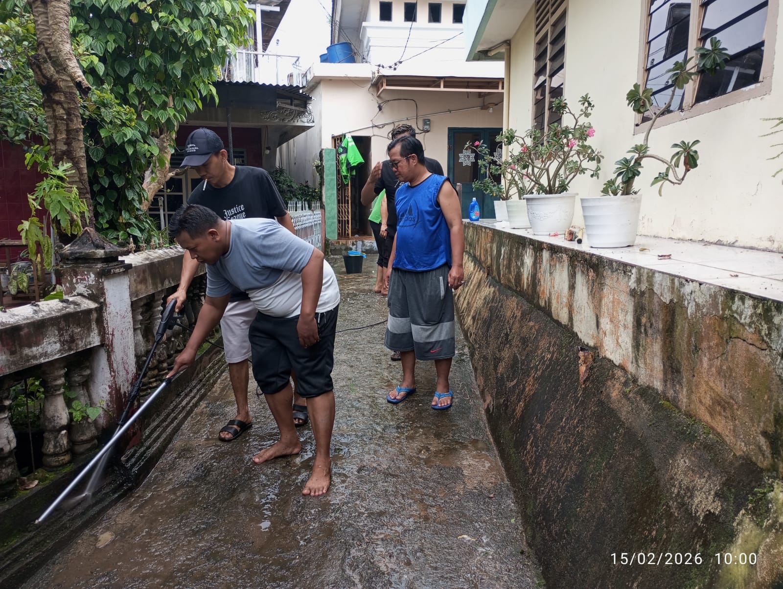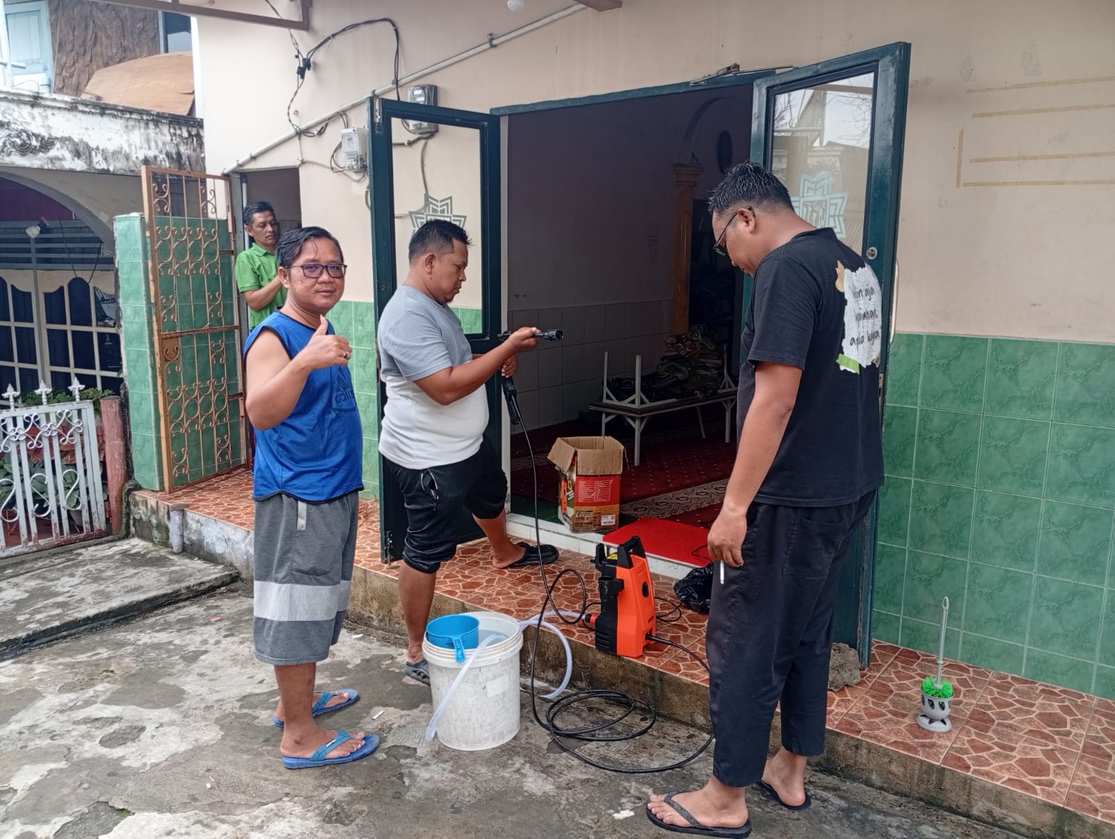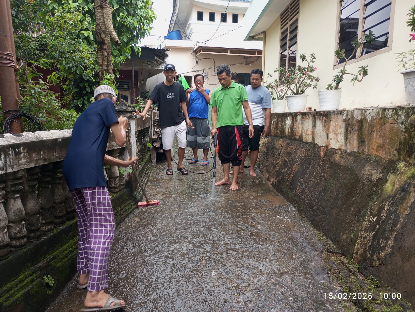 Semangat gotong royong warga RW 05 jalan Yos sudarso,lorong pasma putra satu, kelurahan 3 ilir, kecamatan ilir timur 2 Palembang melaksanakan Minggu bersih Musholla Al Munawaroh, Minggu (15/02).
